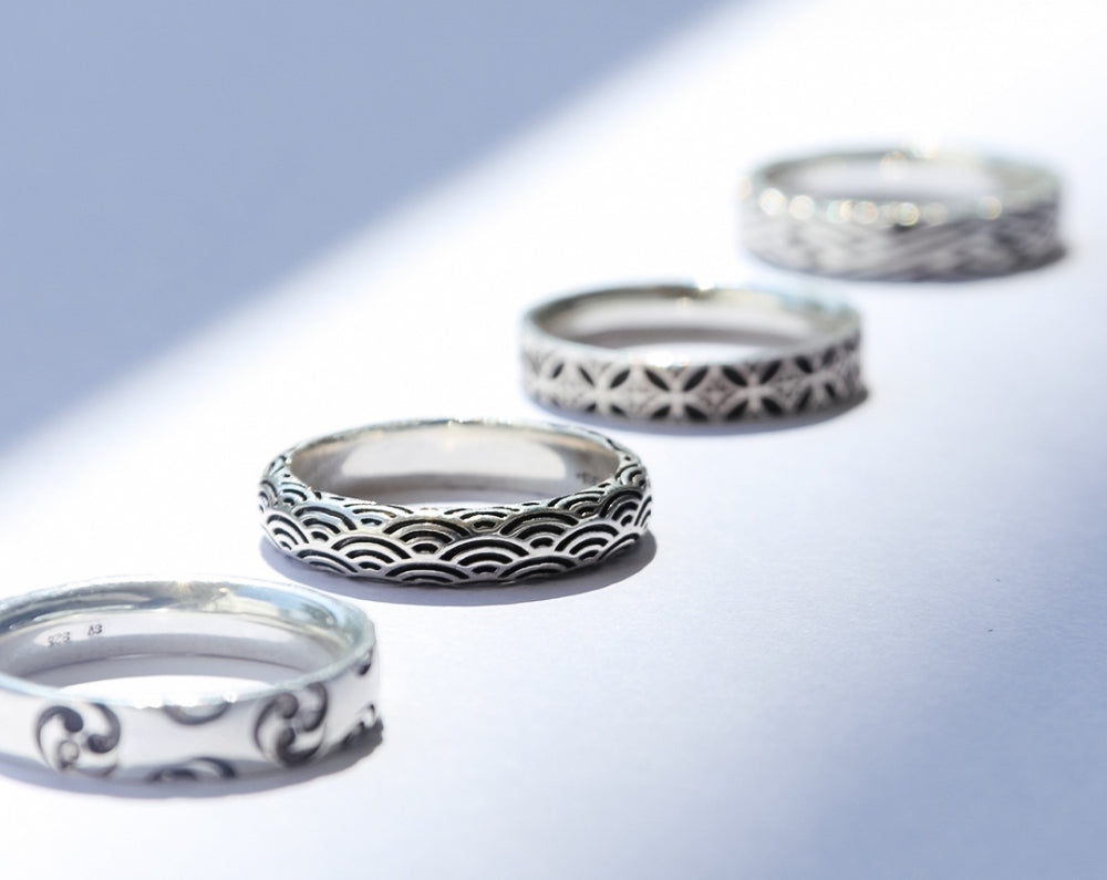 The Seigaiha pattern represents blue ocean waves. This design symbolises peace and good luck. Its calming and rhythmic wave patterns evoke a sense of serenity and continuity, making it a timeless choice for any jewelry piece. You can get these pieces in silver or with a special antique coating.
